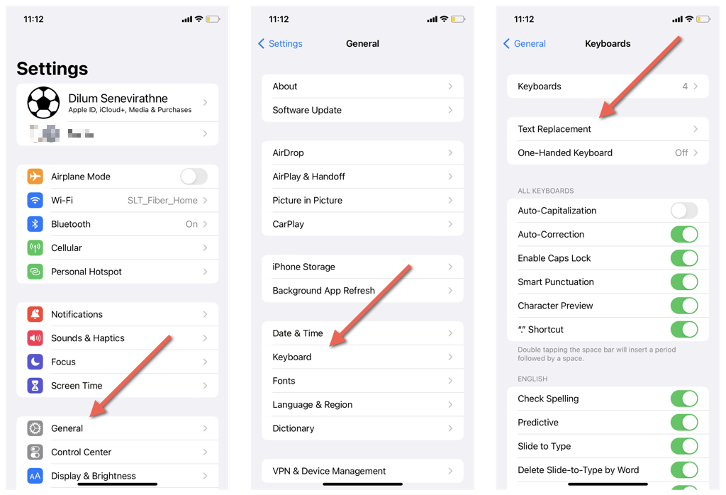 - Tap the special characters key—= Keyboards > Text Replacement.