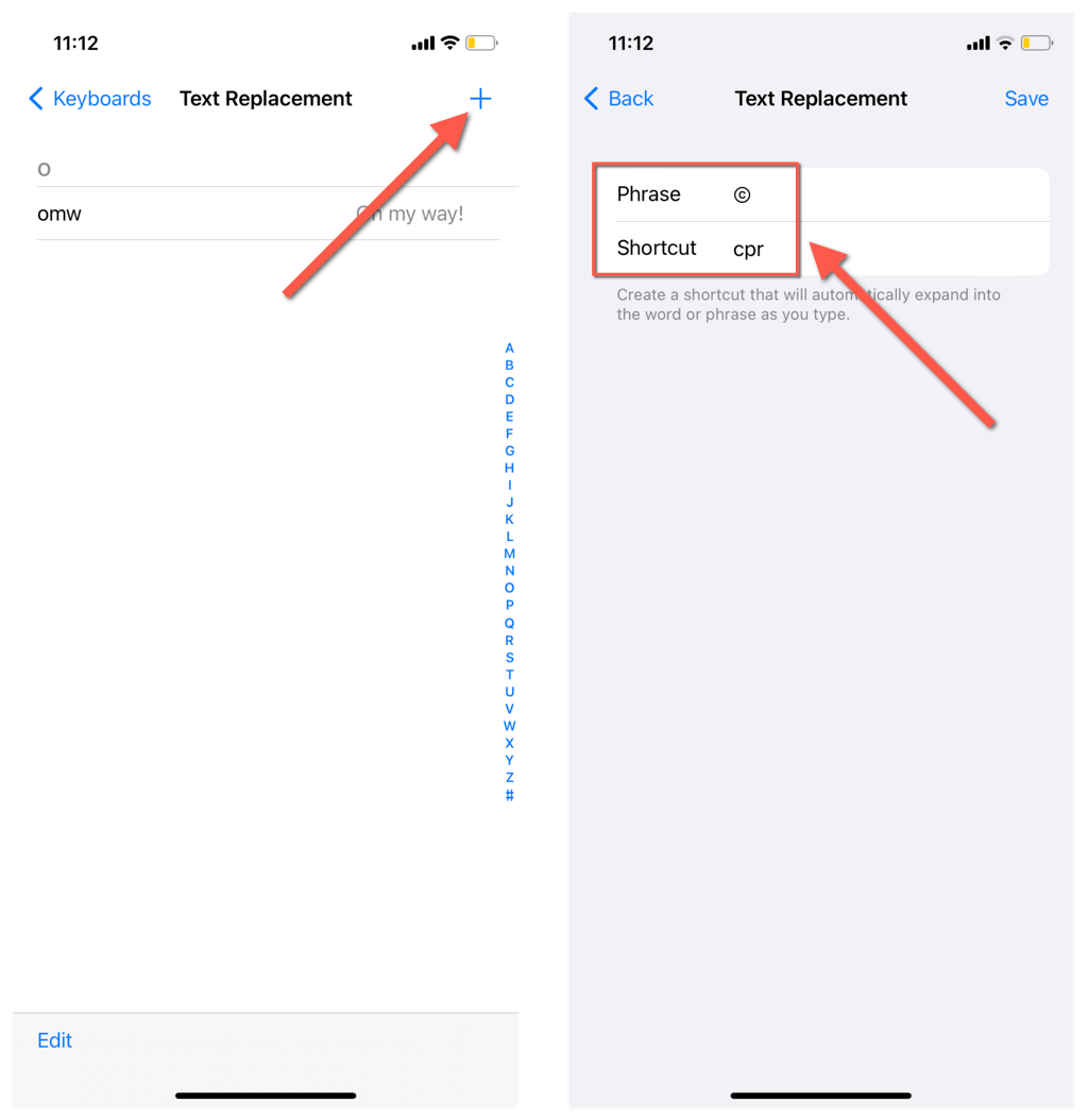 - Tap the Plus icon. * Copy the copyright symbol from an online source and paste it into the Phrase field. * Type a shortcut into the Shortcut field—e.g., cpr.