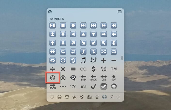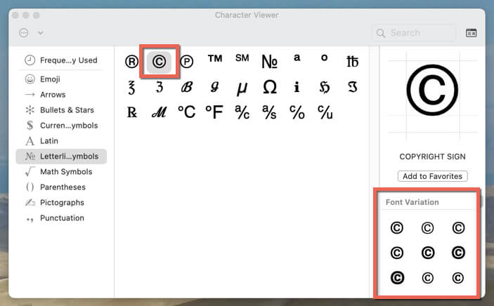 - Switch to the Letterlike Symbols category on the sidebar or search for Copyright.