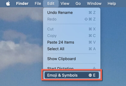 - Open Finder and select Edit > Emoji and Symbols on the menu bar. Or, press Control + Command + Space.