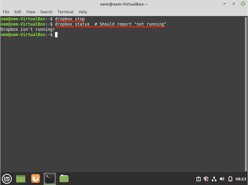 - Run the following commands to stop the Dropbox app from running in the background: * dropbox stop