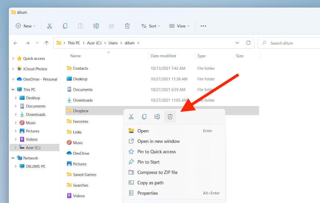 Despite removing Dropbox, its sync folder will continue to remain on your computer. If you want to delete it as well, open your PC’s system drive (Local Disk: C) and select Users > [Your User Name]. Then, right-click the Dropbox folder and select Delete or the Trash icon.