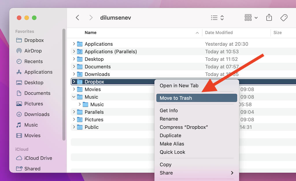 To do that, go to Macintosh HD > Users > **[Your User Name] **(or control-click Dropbox on the Finder sidebar and select Show in Enclosing Folder). Once inside, create a backup of the Dropbox folder (if needed). Then, control-click and choose Move to Trash.