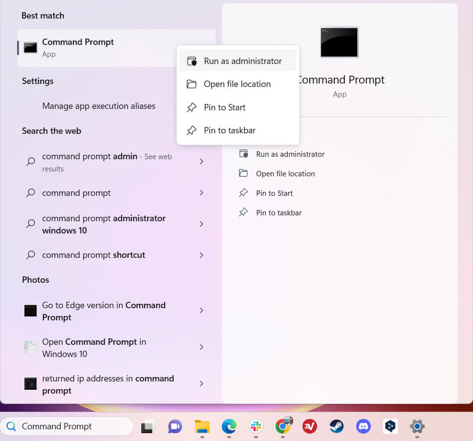 - Press Windows Key + S to open Windows Search. * Type Command Prompt, right-click the result, and then select Run as Administrator.