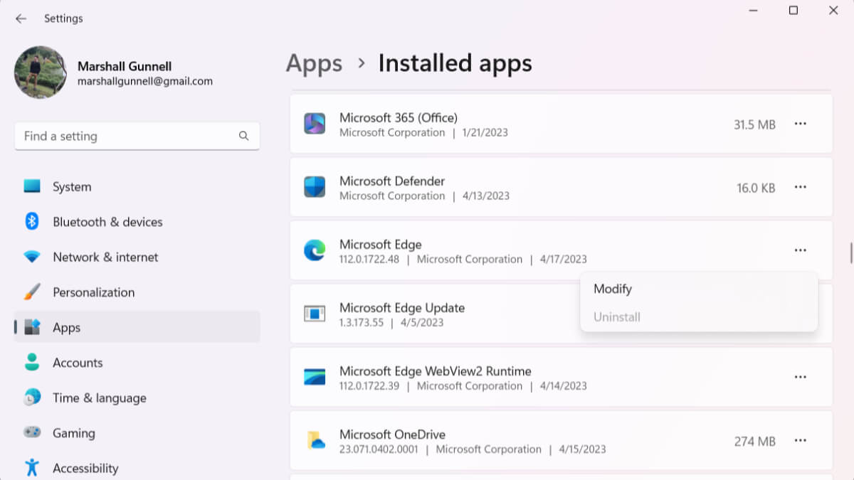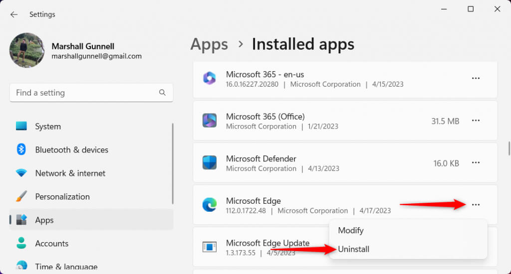 - Now, press Windows Key + I to open the Settings app. In Apps, find Microsoft Edge, click the three dots, and then select Uninstall.