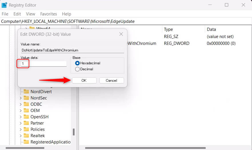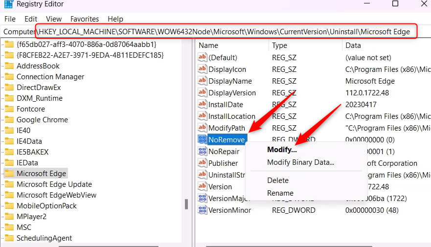 - Navigate to HKEY_LOCAL_MACHINE\SOFTWARE\WOW6432Node\Microsoft\Windows\CurrentVersion\Uninstall\Microsoft Edge. * Right-click NoRemove and select Modify from the context menu.