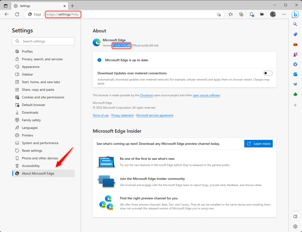 - * Open Microsoft Edge, type edge://settings/help in the address bar, and then press Enter.