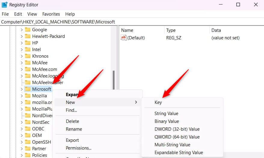 - The User Account Control (UAC) prompt will appear. Click Yes. * In the Registry Editor, navigate to HKEY_LOCAL_MACHINES\SOFTWARE\Microsoft. * Right-click the Microsoft folder, hover your cursor over New, and then select Key.