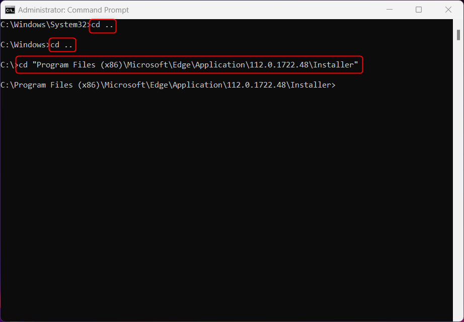 - The User Account Control (UAC) prompt will appear. Click Yes. * Navigate to Edge’s “Installer” directory by using the cd command. Depending on which directory your Command Prompt opens in by default, you may need to use the cd .. command to go back a level or two. Once ready, run this command: cd “Program Files (x86)\Microsoft\Edge\Application\\Installer” Replacewith your actual version number copied earlier.