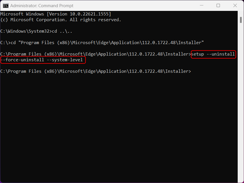 - Next, run this command to uninstall Microsoft Edge. Setup –uninstall –force-uninstall –system-level