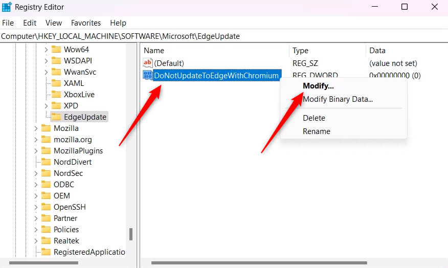 - Right-click the newly-named DoNotUpdateToEdgeWithChromium value and select Modify from the context menu.