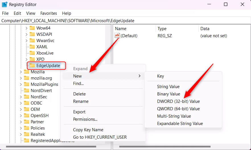 - Rename the new Key to EdgeUpdate. * Right-click EdgeUpdate, hover your cursor over New, and then select DWORD (32-bit) Value.