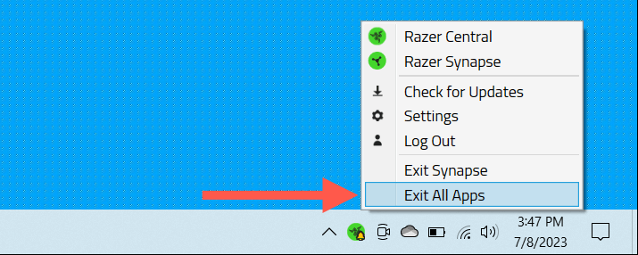 Razer Synapse always runs in the Windows background, so you must quit it—including any other Razer applications on your computer—to minimize problems during uninstallation. To do that, right-click the Razer icon on the system tray and select Exit All Apps.