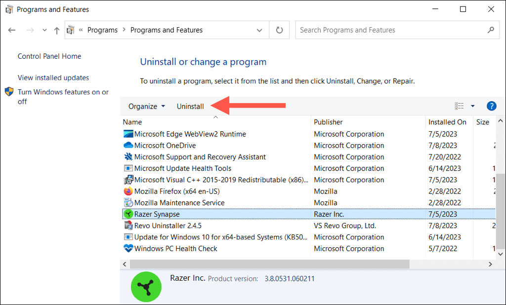 Alternatively, use the older Programs and Features applet in the Windows 10/11 Control Panel to remove Razer Synapse.