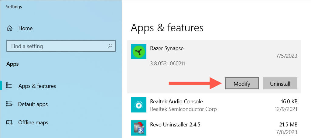 You can uninstall Razer Synapse through the Apps and Features/Installed Apps console in Windows 10 and 11. Here’s how: