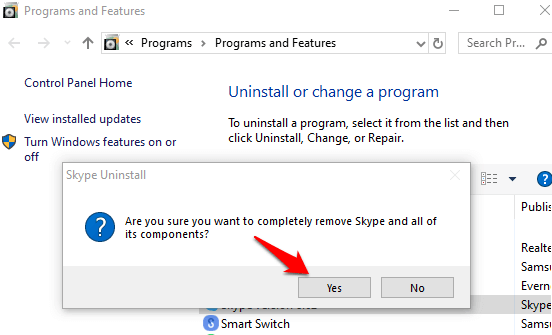 - Open **Control Panel > Programs > Programs and Features** and click **Uninstall or change a program**. Right-click Skype for Business and select **Uninstall**. If the app isn’t listed, it means the version you’re using is integrated with other Office apps. If you see the **Are You Sure You Want to Uninstall Skype and all its components** box, click **Uninstall** and then click **Close **once the process is completed.