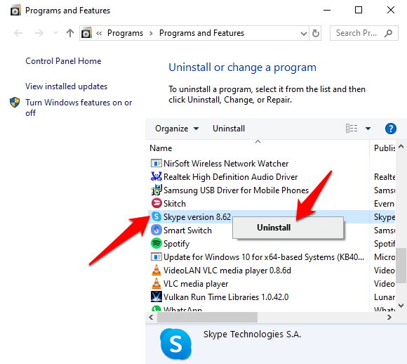 - Look for Skype in the list, right-click it and select **Uninstall**.