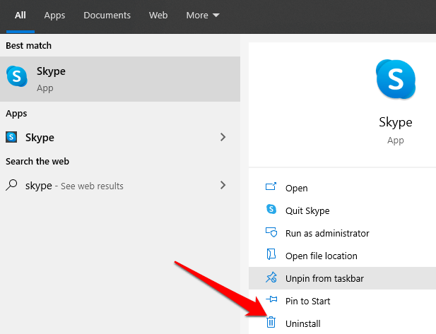 A quicker way to uninstall Skype on Windows 10 is to type “Skype” in the search bar, and then click **Uninstall **from the app’s menu on the right. If you don’t see the Uninstall option, click the down arrow to expand the menu.