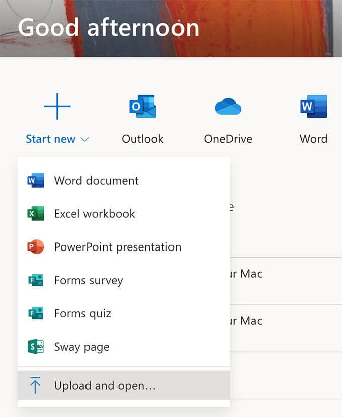 When the main interface loads-up, click on the option that says Start new and select Upload and open. It’ll let you upload your old Word file from your computer.