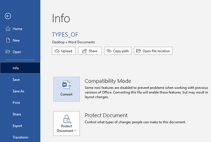 When the document opens, click on the File tab at the top-left corner. Then select the tab that says Info in the left sidebar and click on Convert in the right pane.