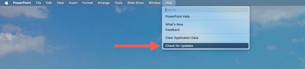 - Open Microsoft PowerPoint and select Help >** Check for Updates** on the top menu.