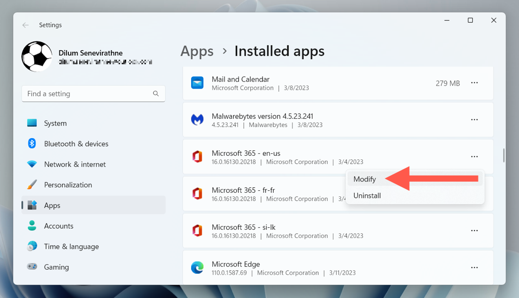 - Select **Microsoft Office **> **Modify**.