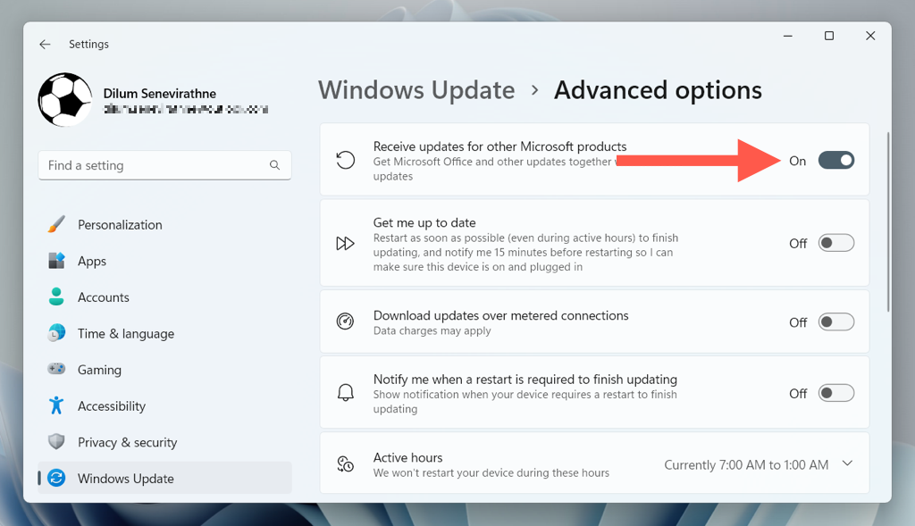 - Activate the switch next to **Receive updates for other Microsoft products**.