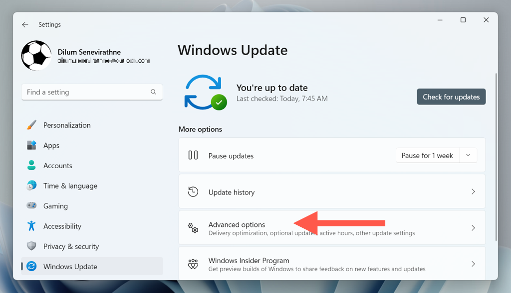 - Select **Windows Update**, and then choose **Advanced options**.