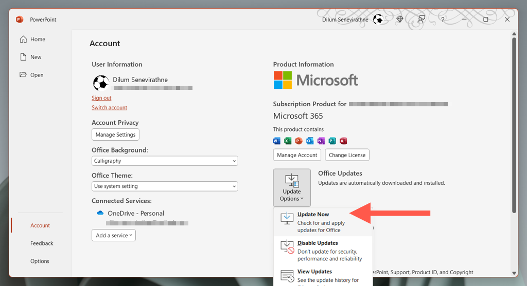 By default, MS Office apps like PowerPoint, Word, and Excel update themselves automatically whenever Microsoft pushes out a newer version. However, if automatic updates are disabled, don’t work correctly, or you just want to confirm if PowerPoint’s up-to-date, try the methods below.