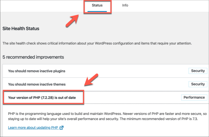 - If your WordPress PHP version is out of date, this will be listed as a recommendation in the Status tab.