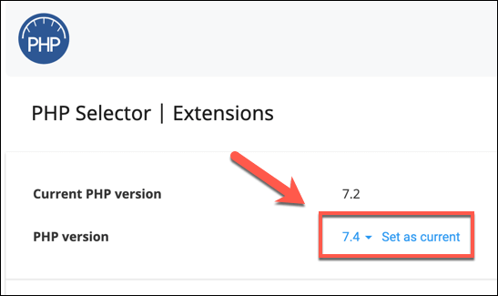 - The PHP Selector tool allows you to change the PHP version currently in use on your server. Choose a version equal or above the minimum WordPress supported version (currently PHP 7.3) from the PHP Version drop-down menu, then press Set as current to apply it.