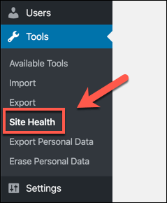 To make sure you’re running the correct PHP version, you can check your current WordPress installation using the Site Health menu in WordPress 5.2 and later. * To do this, log in to your WordPress admin page. You’ll need to have a user account that has the Administrator role applied. Once you’re signed in, press Tools > Site Health from the side menu.