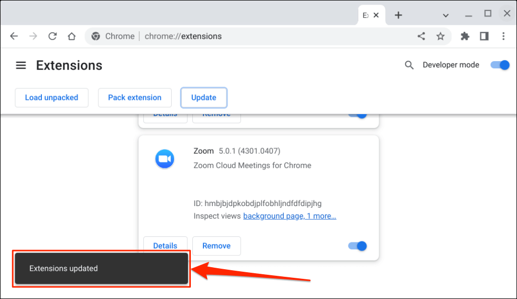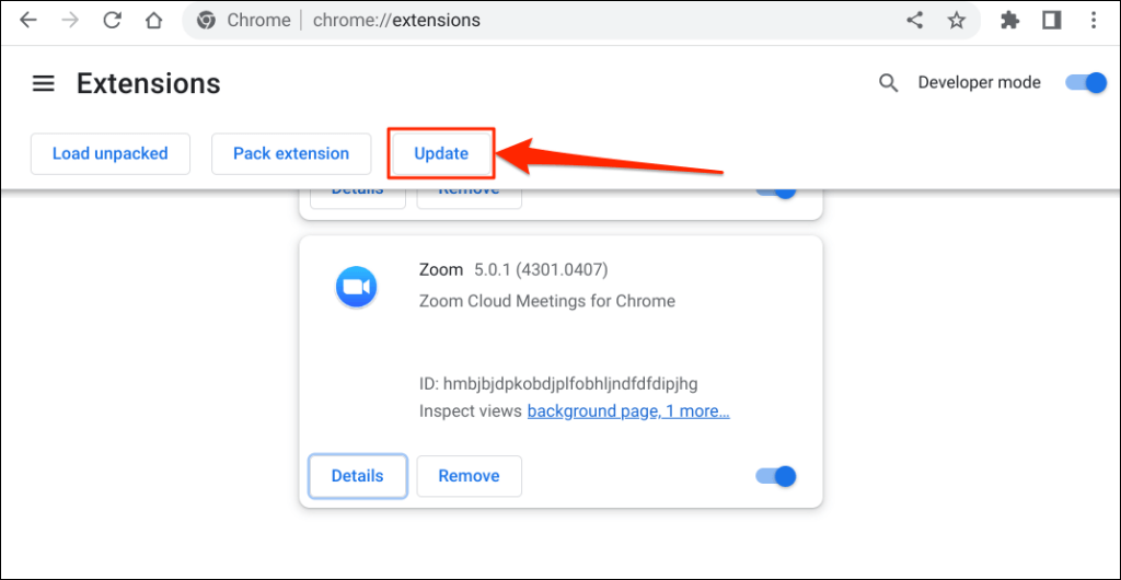 - Next, tap the Update button on the top menu to continue. That will update all your Chrome extensions, including Zoom.