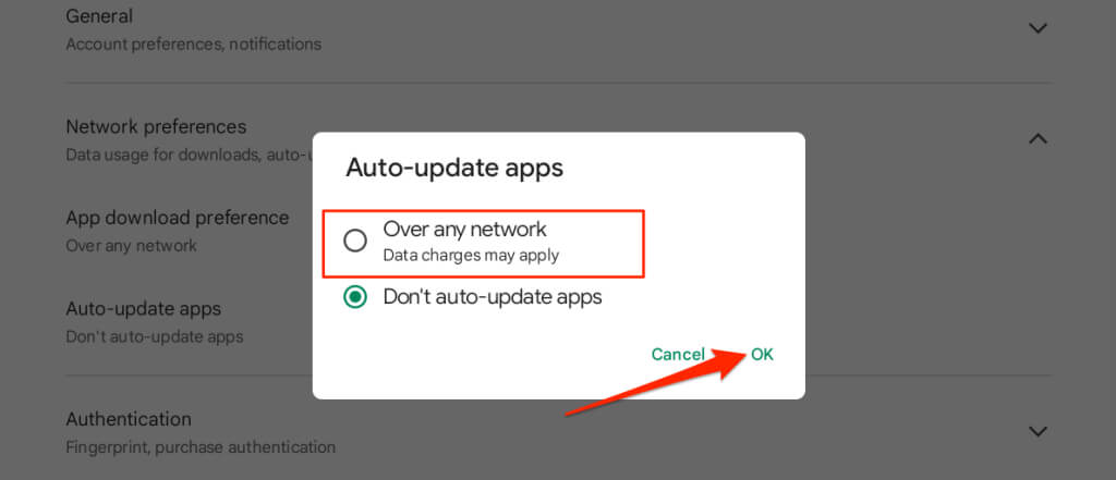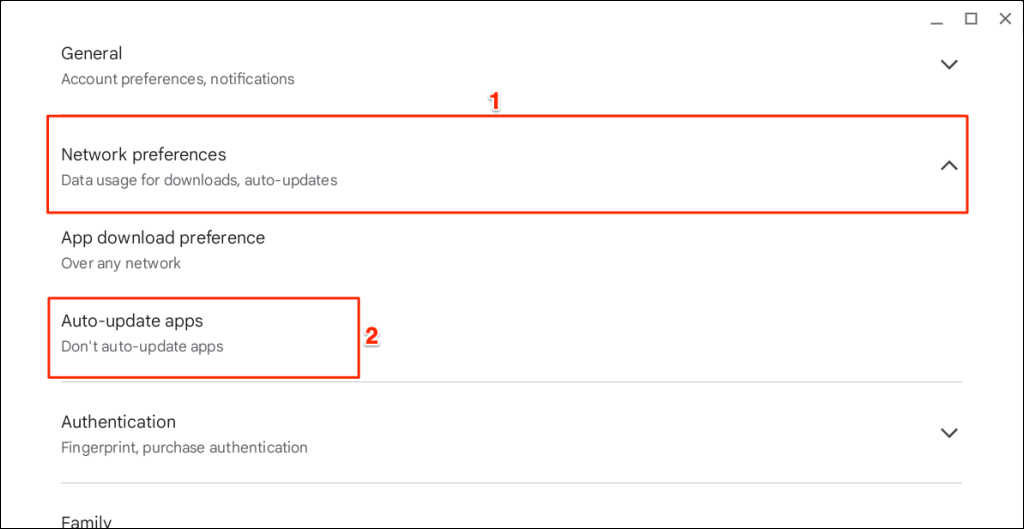 - Expand the Network preferences drop-down menu and select Auto-update apps.