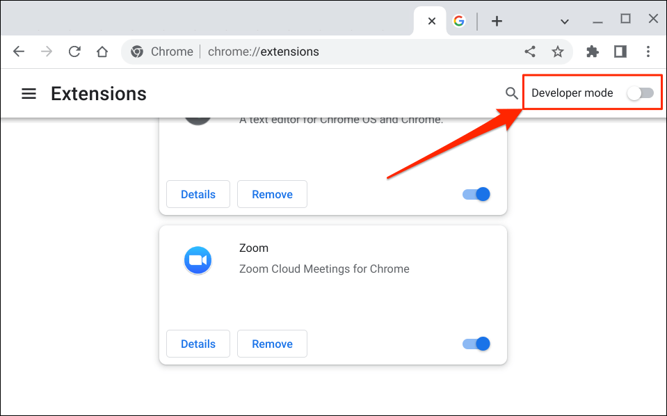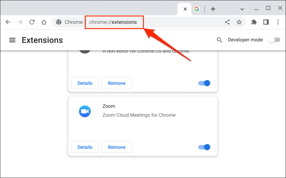 - Close the Zoom app and open the Google Chrome browser. Type or paste chrome://extensions in the address bar and press Enter on your Chromebook’s keyboard.