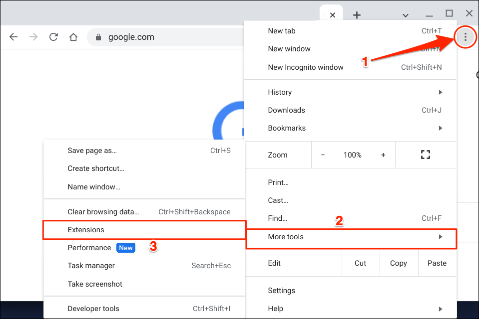 Alternatively, select the three-dot menu icon in the top-right corner, select More tools, and choose Extensions.