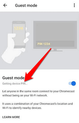 - If Guest Mode is listed in your Chromecast’s Device Settings, check whether there’s a **PIN** displayed underneath it. This indicates that the setting is already enabled, and you can proceed to cast content normally. If you don’t see a **PIN** underneath the Guest Mode setting, it means you can cast in Guest Mode but the setting has been disabled. In this case, tap **Guest Mode** and then toggle the switch to **On**.