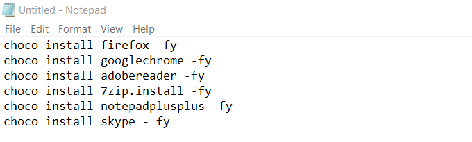 After listing all the apps you want to include, you can use a single line to install them all at the same time using the following code for the example above: choco install firefox -fy.install install firefox -fy.adobereader -fy.install 7zip.install -fy.install notepadplusplus -fy.install skype – fy