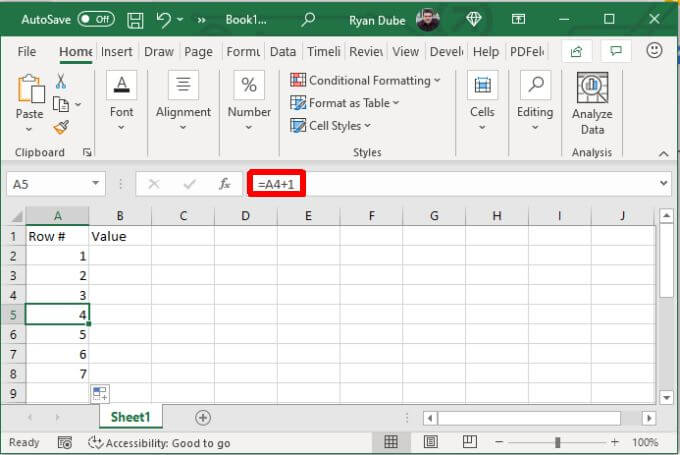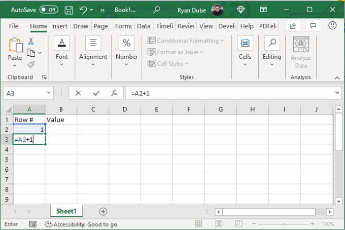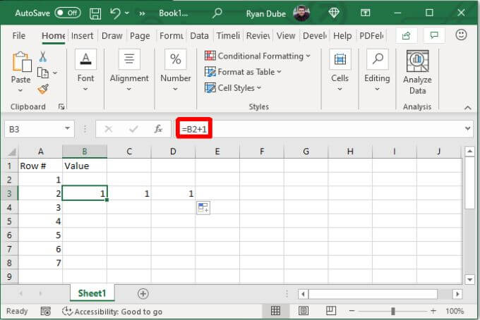 If you want to perform a calculation in the next cell based on this cell, by adding 1 to it, you will write the following formula: