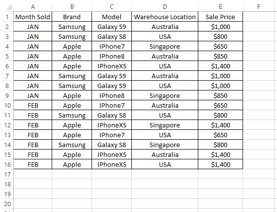 Let’s say we are starting a new online business selling mobile phones and we have a sheet that lists the sales that we have made in the first two months. Download example Excel spreadsheet here.