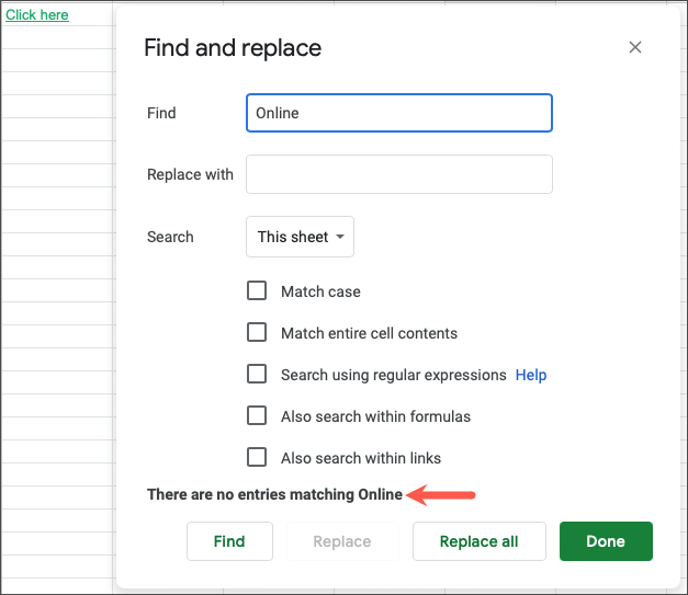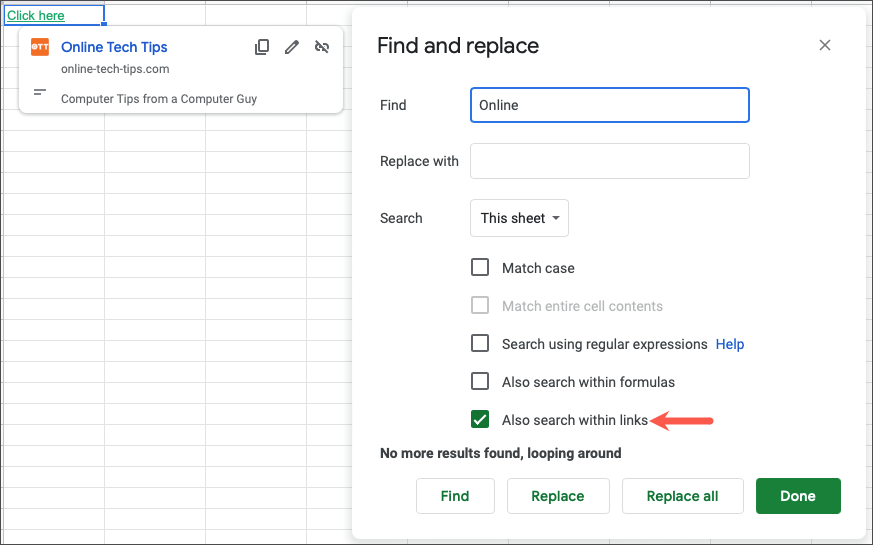 Now, check the box for Also search within links and you’ll see the correct cell highlighted.