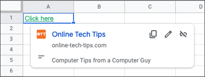 For an example, here we have a cell containing the text “Click here” which is linked to Online Tech Tips. This gives us a fast way to visit our site.