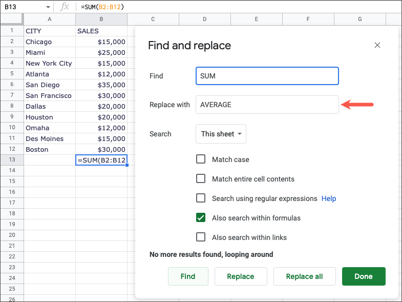 Here, we’ll search for “SUM” and replace it with “AVERAGE.”