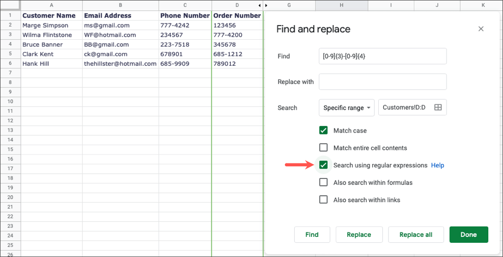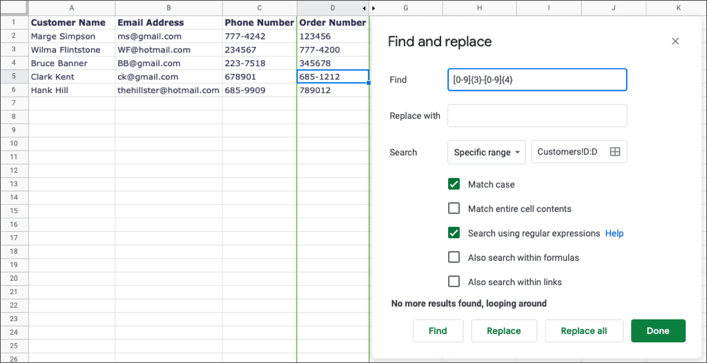For an example, we have some phone numbers in our sheet in the wrong field. We’ll search for these phone numbers in the selected cells using this regular expression: