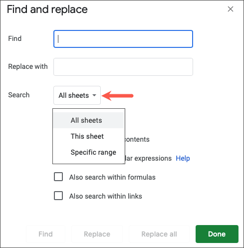 When the Find and Replace dialog box opens, enter what you want to find (and optionally replace) at the top. Next to Search, choose All sheets, This sheet, or Specific range.