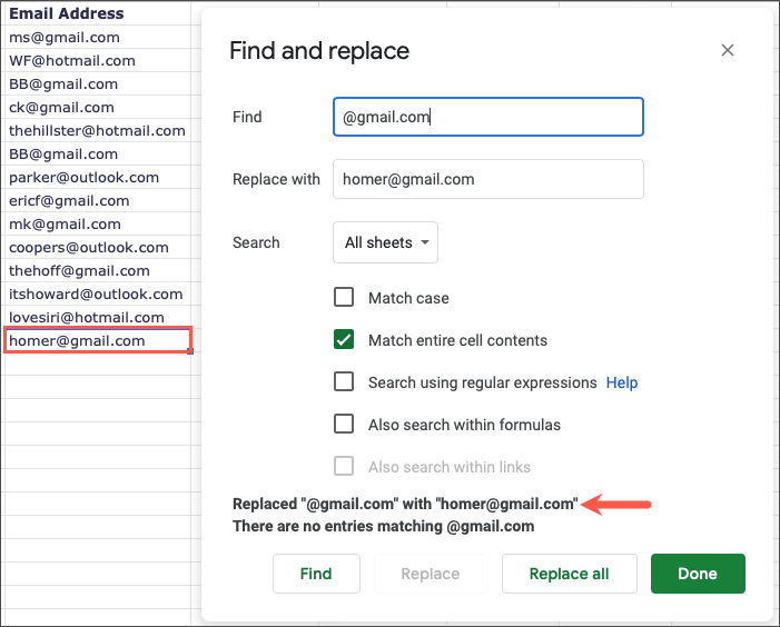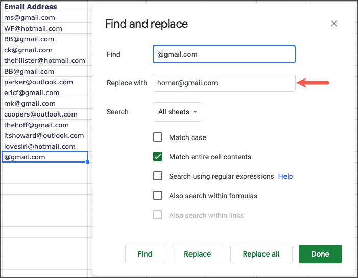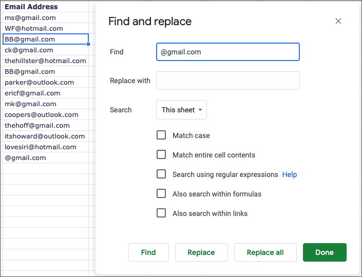 Here, we’ll search for “@gmail.com” and replace it with “[email protected].”