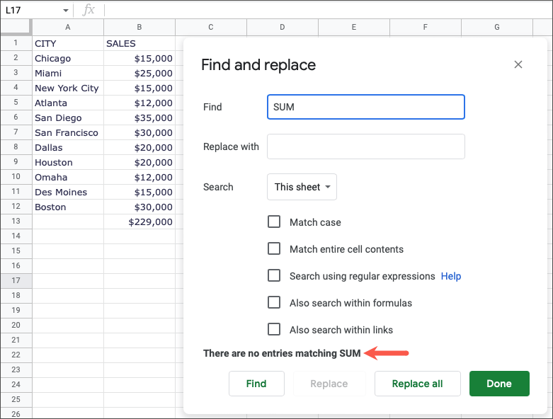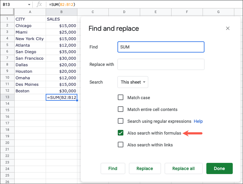 You may need to find data that doesn’t exist within a cell but inside of a Google Sheets formula. For instance, maybe you want to find the cell where you applied the SUM function. In this case, you’d check the box for Also search within formulas.