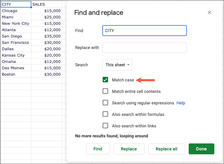 If you have data with both upper and lowercase letters, you can check the box for Match case to search more accurately.