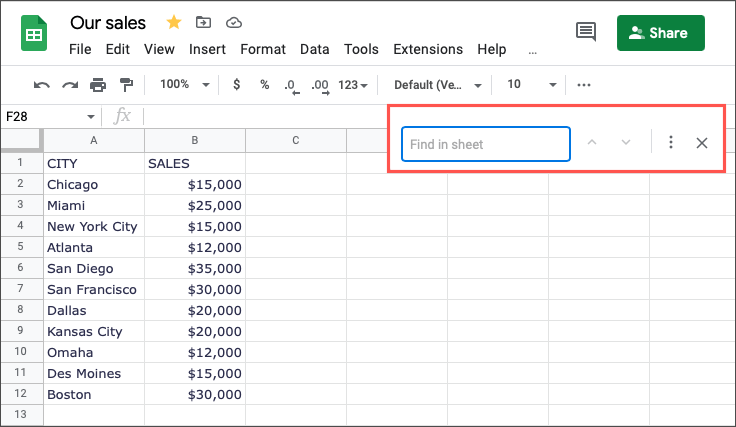 Use the keyboard shortcut Ctrl + F on Windows or Command + F on Mac. You’ll then see the Find tool appear on the top right of the sheet.