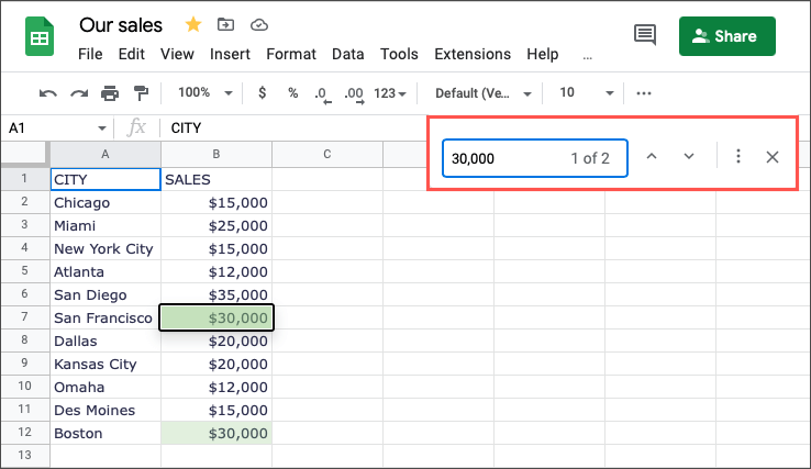 Google Sheets then highlights each result as we select the Find button until no more results are found.